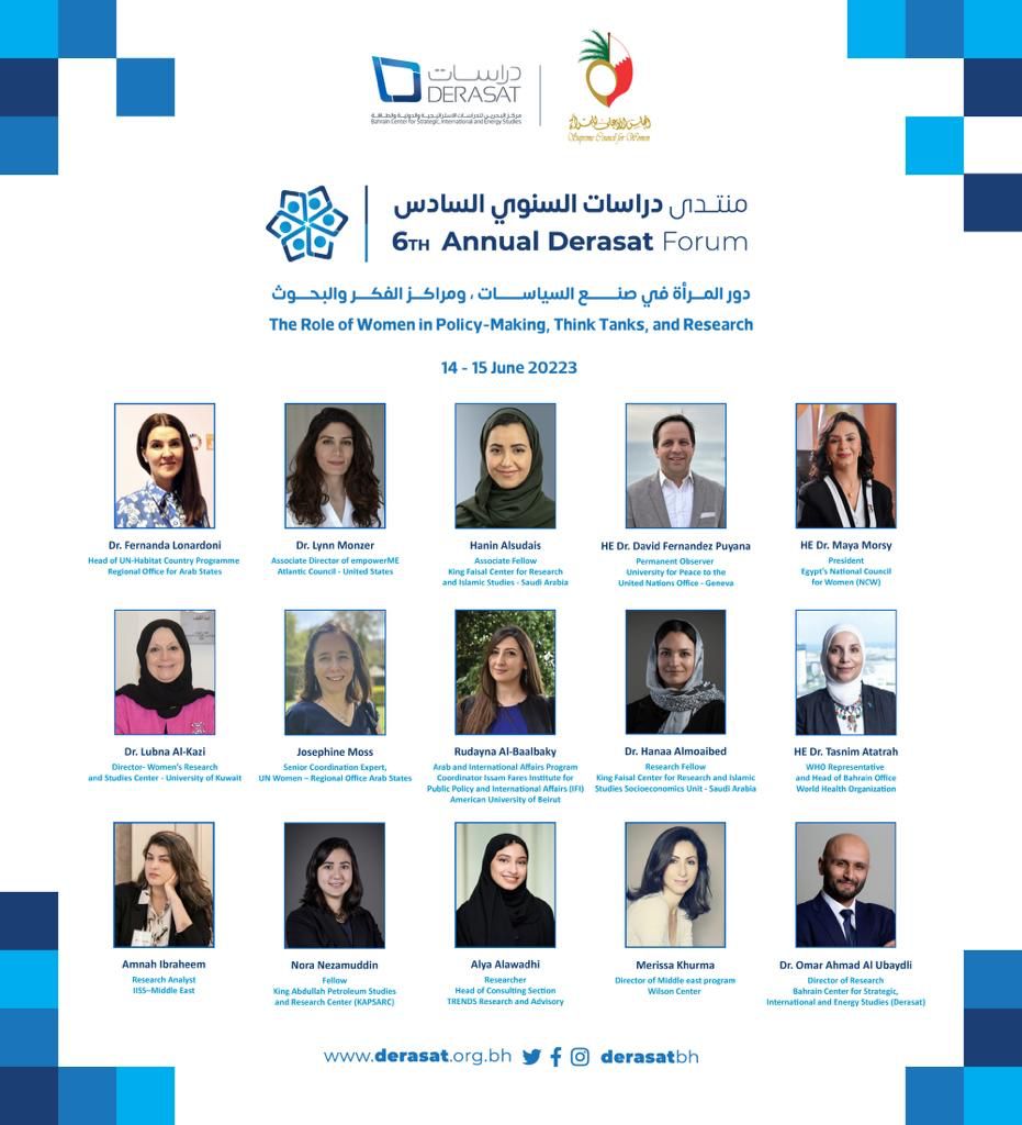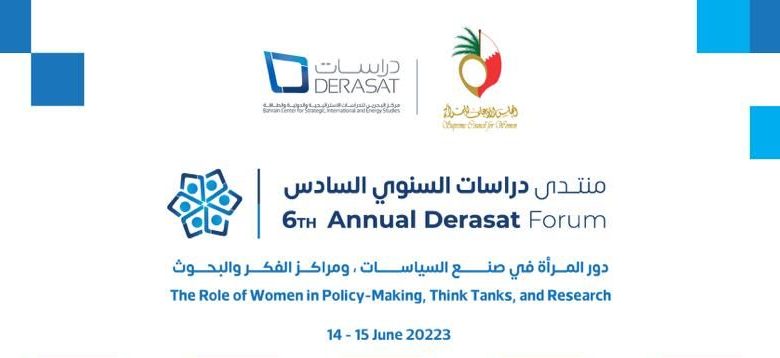 تنطلق أعمال منتدى مركز البحرين للدراسات الاستراتيجية والدولية والطاقة “دراسات” السنوي السادس على مدى يومي 14 و15 يونيو الجاري بعنوان “دور المرأة في صنع السياسات.. ومراكز الفكر والبحوث”، بالتعاون مع المجلس الأعلى للمرأة بمشاركة ممثلي مراكز البحوث والدراسات والهيئات والمنظمات الدولية، وعددٍ من الخبراء والإعلاميين، والمختصّين المعنيين، من عدة دولٍ لمناقشة آخر التطورات والمتغيرات المتعلقة بالتحديات والفرص للمرأة في صنع السياسات ومراكز الفكر.