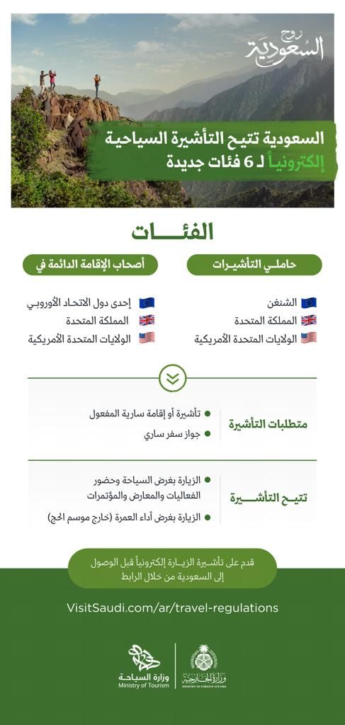 الهيئة السعودية للسياحة تتيح التأشيرة السياحية الكترونياً لسِت شرائح جديدة